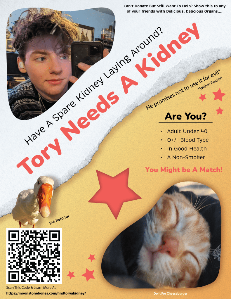 Thanks to Tory’s kind kidney donor, we no longer need to search for a suitable candidate, but medical bills and other needs are quickly piling up. If you’re interested in donating helpful items or funds toward medical bills, check out the “How Else To Help” Section!