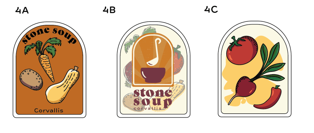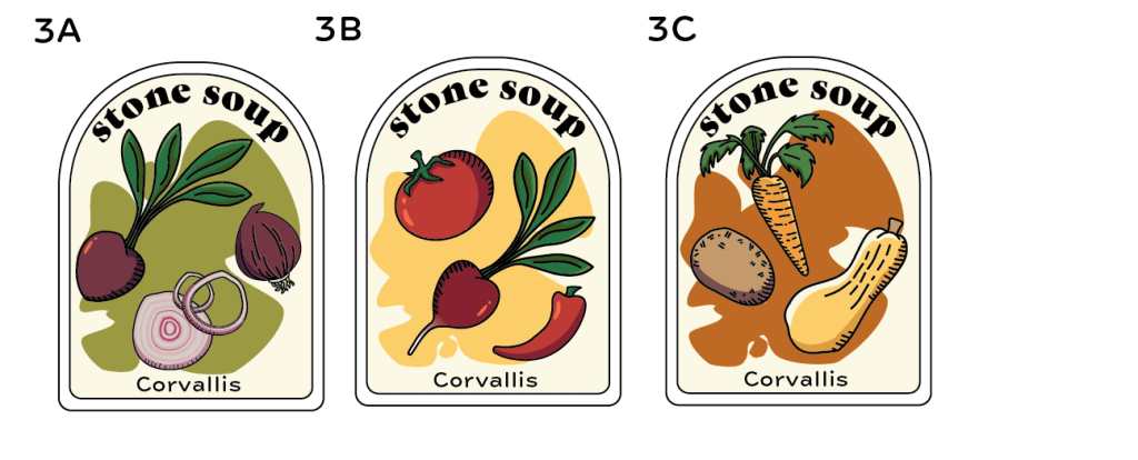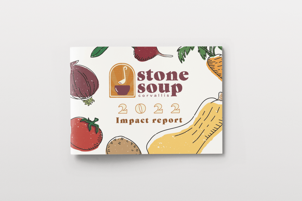 Each member of the team provided potential Impact report layout examples to be considered by client. The goal of this brand redesign was to both revitalize the image of the Stone Soup Corvallis organization, while also allowing for a familiar and approachable appearance, much like a farmers market. It utilizes branding Illustrations designed by me; rough texture and and loose color fills invoke a homey, folksy, non-intimidating feeling for nervous first time service users.