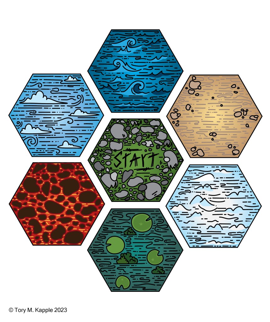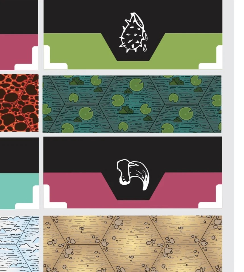 The team’s objective was to create a hextile-based board game insprired by our favorite games and the fantasy genre. My role in the project was to design repeating patterns and textures for each biome and setting in the game, provide design elements for the box in collaboration with other team members, and design standing player pieces to be moved throughout the board. The teams vision for the characters were to be partially androgenous, visually distinct, yet coordinating styles and colors to unify the experience.