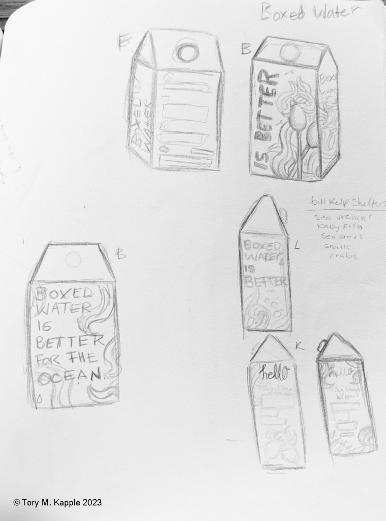 In my original sketch of the water cartons, I planned to utilize more of the empty space for my illustrations (first mockup shown below) but ultimately I decided against overdoing it, given how minimalist the current branding is.