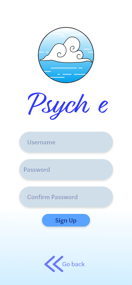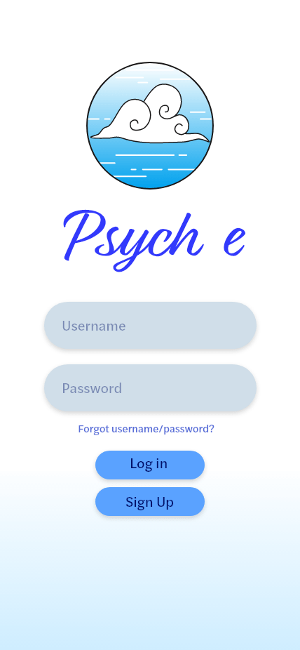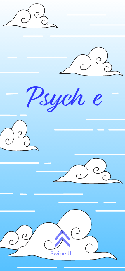 As a group exercise, we developed an idea for a mental health app and decided the logistics and necessities to include. From there, we each diverged onto our own paths and individually created visual identities to compare after completion. The name Psych E is a play on both the word psyche to reference electronic mental care, as well as a reference to the Greek Goddess of the soul, Psyche. The clouds and sky motif are meant to represent both the home of Psyche, Olympus, as well as the common phrase “head in the clouds” to mean unfocused or dazed. I chose a soft blue and white color palette to bring comfort and relaxation to the user, as they are likely feeling unwell or stressed at time of use. Within simulations, the clouds on the background and in the logo would cycle through a side scroll to mirror rolling clouds in the sky.