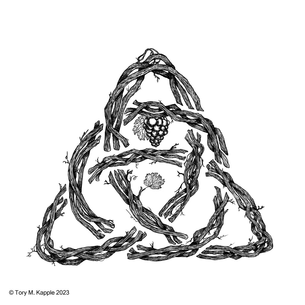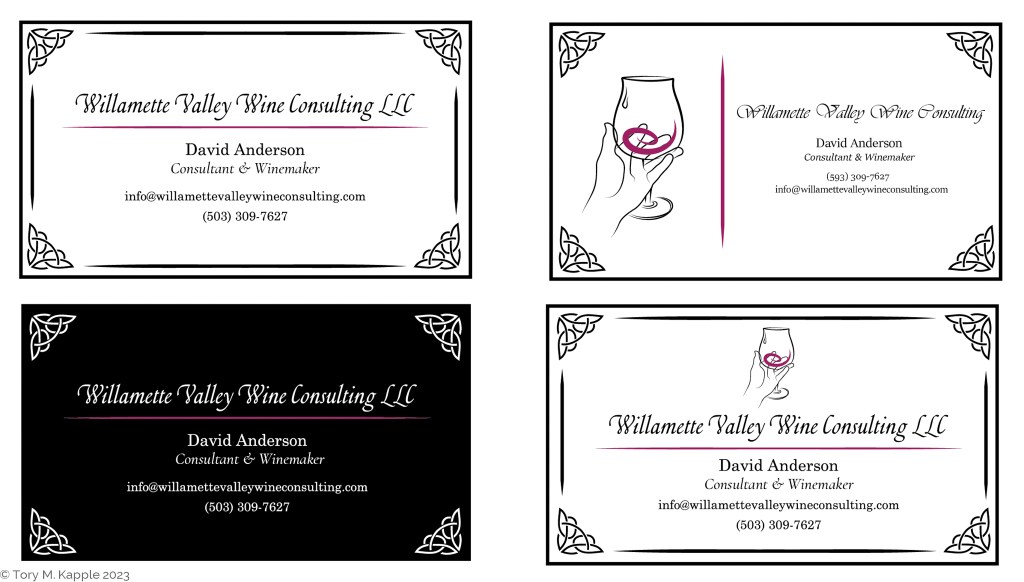 Celtic knots are personally significant to the client and wanted to include some simple knotwork into the card design. The client also preferred to follow winery trend of including a hand rendered black and white drawing, but with a slight twist on the concept. Calling back to the clients affection for the classic trinity knot, the back includes a large central knot made up entirely of thick, woody, mature grape vines in the prime of their production.