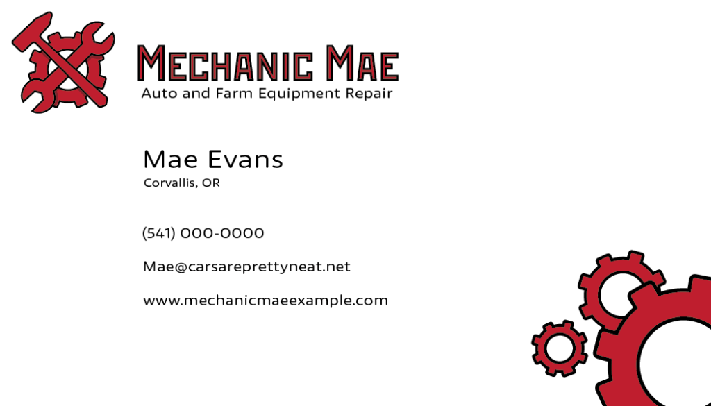 Business card for local mechanic based on her interests and values.